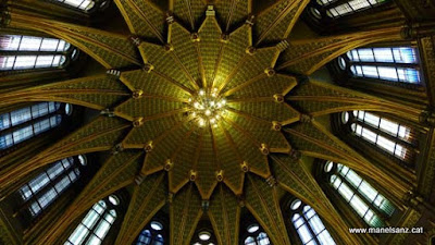 Un detalle del techo. Esta cúpula resguarda la corona de Sant Esteban, también lo hace una pareja de soldados donde podemos ver el cambio de guardia. Hoy, hay visita de algún político extranjero y los policías de seguridad del Parlamento están excesivamente expeditivos con los turistas.
